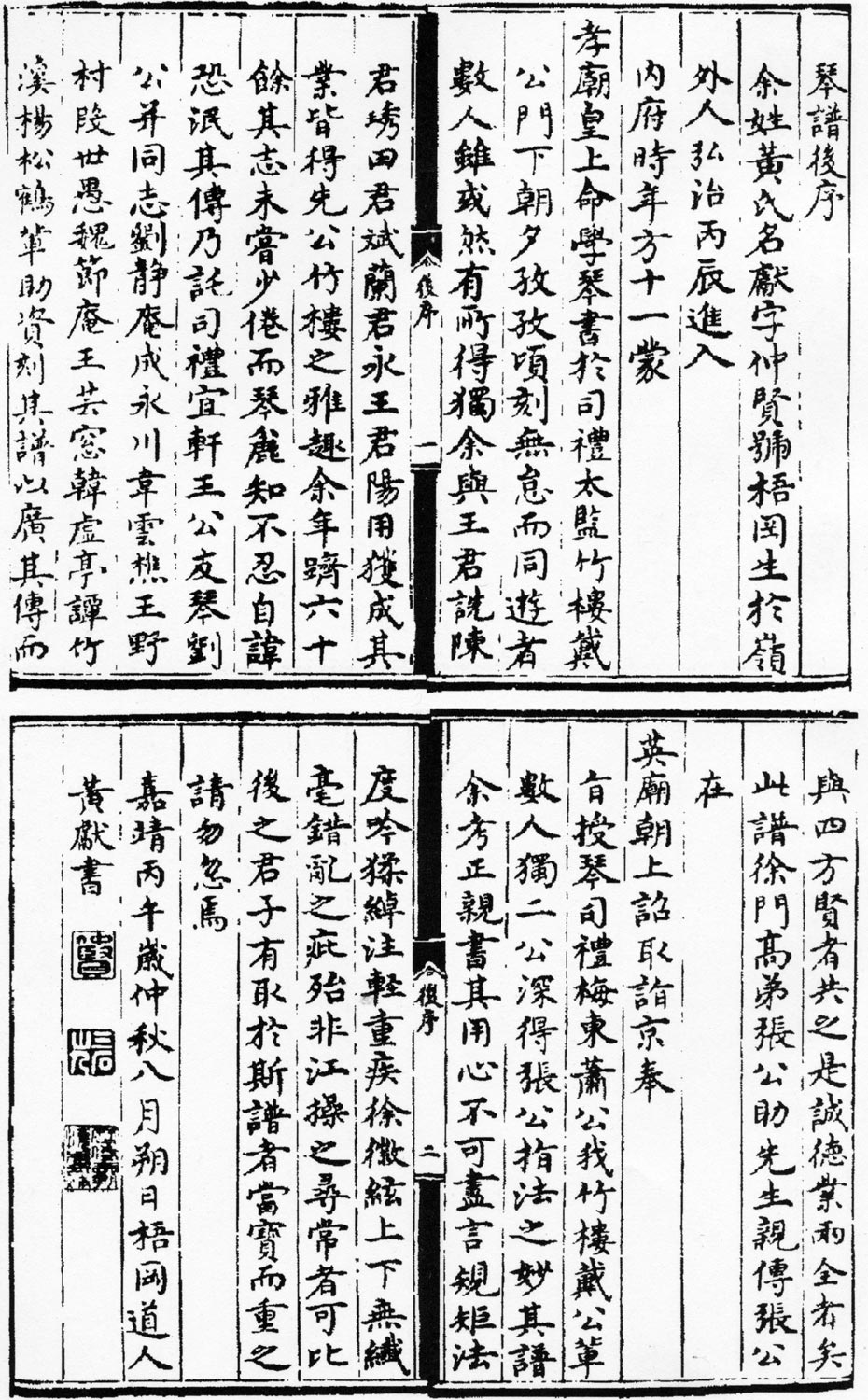 (This handbook) in the collection of the Beijing library,16 printed in the Ming dynasty, (is) a specialized collection of qin tablature compiled by (the eunuch) Huang Xian of Pingle county in Guangxi province. In front there is a preface by Chen Jing dated 1546. The book is divided into two folios. At the end of the (2nd) folio is an afterword (also dated 1546) by Huang Xian. Altogether there are 42 pieces. (One has lyrics.17)