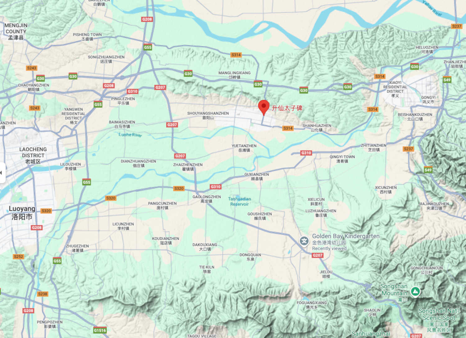 However, none of these names was helpful in finding this "mountain", said to be more of a hill somewhat separate from the Song Mountains proper. On other hand it was possible to find the stele, said to have been placed on the spot in 699 by Empress Wu Zetian, as mentioned above. Called 升仙太子碑 Stele of the Crown Prince's Ascent", it can be located on this map; in addition to the stele, further images can be found by searching for "升仙太子碑" and looking at the article on Chinese Wikipedia.