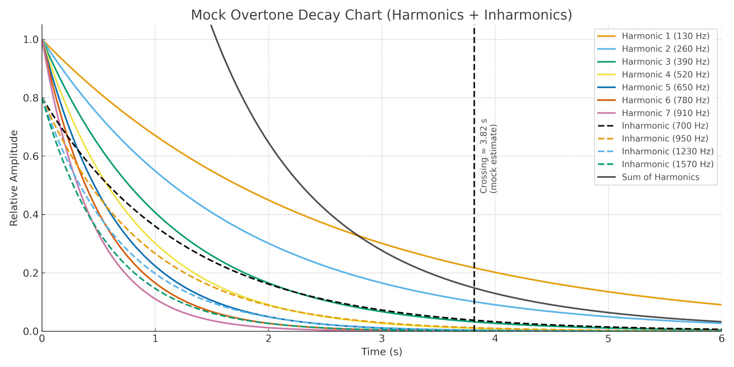 Because the actual notes have not yet been properly analyzed, the above is just a mockup giving an idea of what it might look like. In this mockup, each overtone was drawn with the same starting amplitude (1.0). The black line represents their sum. It begins at time zero, but is hidden under the other lines until the curves separate; in a real measurement, the overtones would have different starting strengths, so the sum line would be distinct from the beginning.